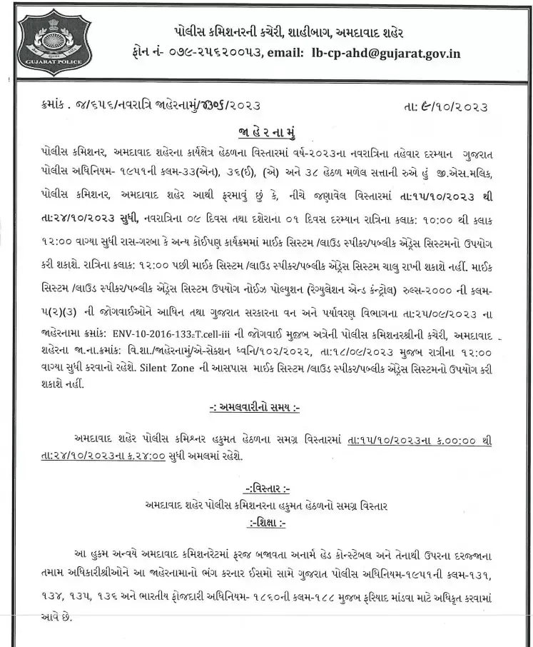 નવલી નવરાત્રિ શરૂ થવાને હવે ગણતરીના જ દિવસો બાકી છે. આ દરમિયાન અમદાવાદ શહેર પોલીસ કમિશ્નર દ્વારા જાહેરનામું બહાર પાડવામાં આવ્યું છે. જે મુજબ નવરાત્રિ દરમિયાન રાત્રે 12 વાગ્યા સુધી જ લાઉડસ્પીકર વગાડી શકાશે.