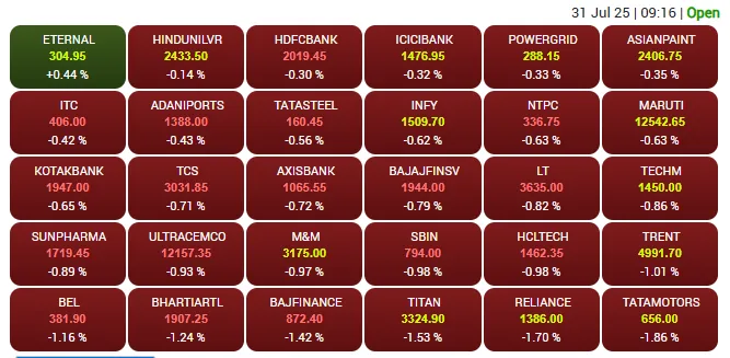 અમેરિકાના રાષ્ટ્રપતિ ડોનાલ્ડ ટ્રમ્પે ભારત પર 25 ટકા ટેરિફની જાહેરાત કર્યા પછી, ગુરુવારે સ્થાનિક શેરબજાર ઘટાડા સાથે ખુલ્યું. શરૂઆતના કારોબારમાં શેરબજારમાં નકારાત્મક વલણ જોવા મળ્યું. ટેરિફને કારણે સર્જાયેલી અનિશ્ચિતતાને કારણે સેન્સેક્સ અને નિફ્ટી લાલ નિશાન પર ખુલ્યા. શરૂઆતના કારોબારમાં, સેન્સેક્સ 786.36 પોઈન્ટ ઘટીને 80,695.50 અને નિફ્ટી 212.8 પોઈન્ટ ઘટીને 24,642.25 પર બંધ રહ્યો.