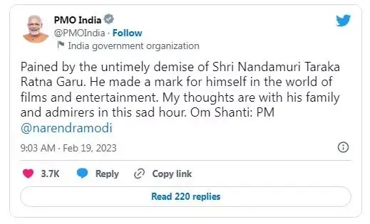 પીએમ નરેન્દ્ર મોદીએ ટ્વીટ કરીને લખ્યું, 'શ્રી નંદામુરી તારક રત્ન ગરુના અકાળ અવસાનથી હું દુઃખી છું. તેમણે ફિલ્મો અને મનોરંજનની દુનિયામાં પોતાની ઓળખ બનાવી. દુઃખની આ ઘડીમાં મારા વિચારો તેમના પરિવાર અને ચાહકો સાથે છે. ઓમ શાંતિ'.