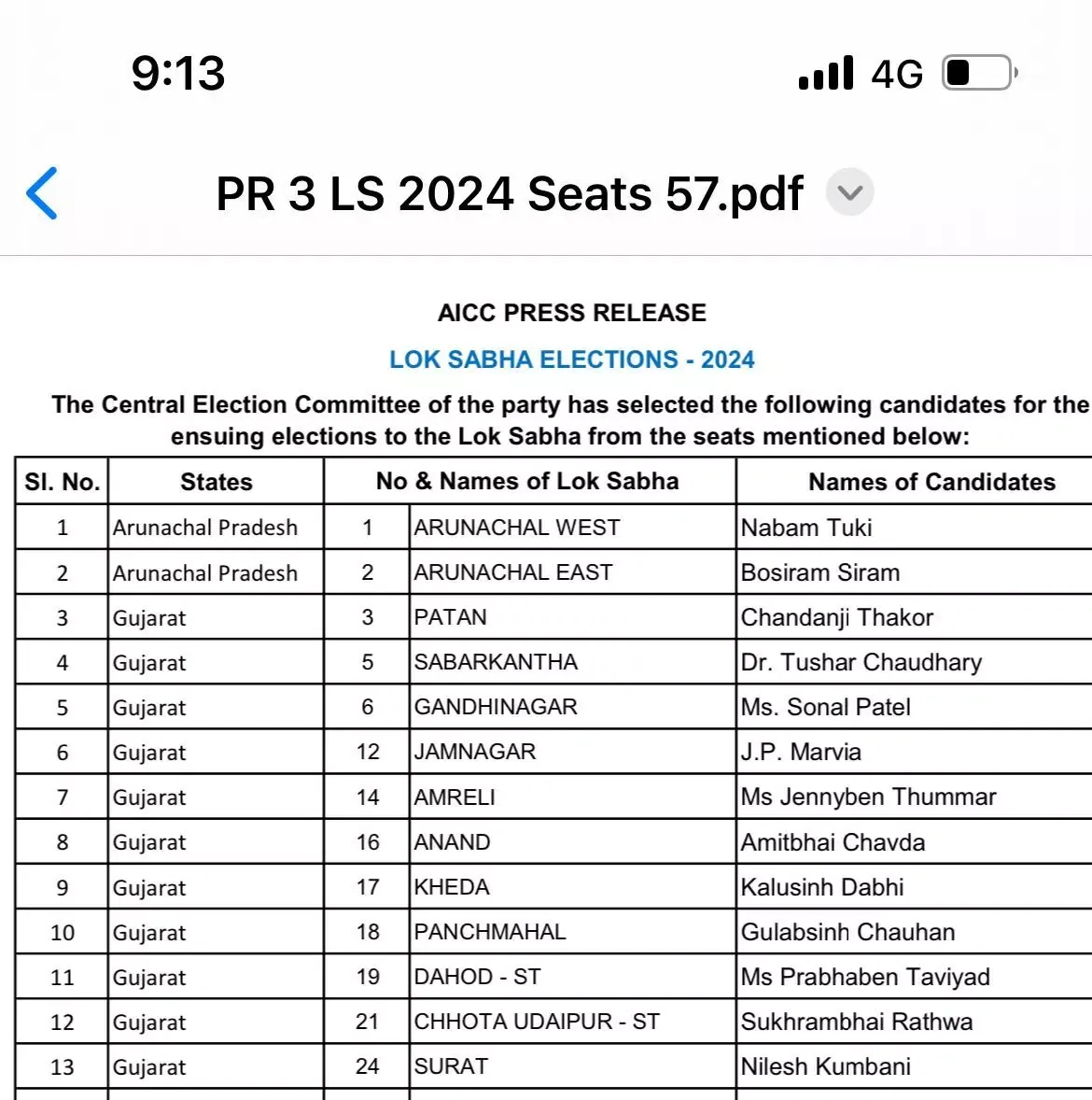 આ યાદીમાં કોંગ્રેસે પાટણથી ચંદનજી ઠાકોર, સાબરકાંઠાથી તુષાર ચૌધરી, ગાંધીનગરથી સોનલ પટેલ, અમરેલીથી જેની ઠુમ્મર, જામનગરથી જે.પી. મોરવિયા, ખેડાથી કાળુસિંહ ડાભી, પંચમહાલથી ગુલાબસિંહ ચૌહાણ, છોટાઉદેપુરથી સુખરામ રાઠવા, દાહોરથી ડો. પ્રભા તાવિયાડ અને સુરતથી નિલેશ કુંભાણીના નામ જાહેરાત કરી છે. જો કે, કોંગ્રેસ દ્વારા તુષાર ચૌધરીને આ વખતે રીપિટ કરવામાં આવ્યા છે. ત્યારે હજુ સાત ઉમેદવારોના નામ જાહેર કરવાના બાકી છે. આ પહેલા કોંગ્રેસે 12મી તારીખે ગુજરાતના 7 ઉમેદવારો જાહેર કર્યા હતા. જેમાંથી અમદાવાદ પૂર્વ બેઠક ઉમેદવાર રોહન ગુપ્તાએ પિતાની નાદુરસ્ત તબિયતનો હવાલો આપીને ચૂંટણી લડવાનો ઇનકાર કર્યો છે.