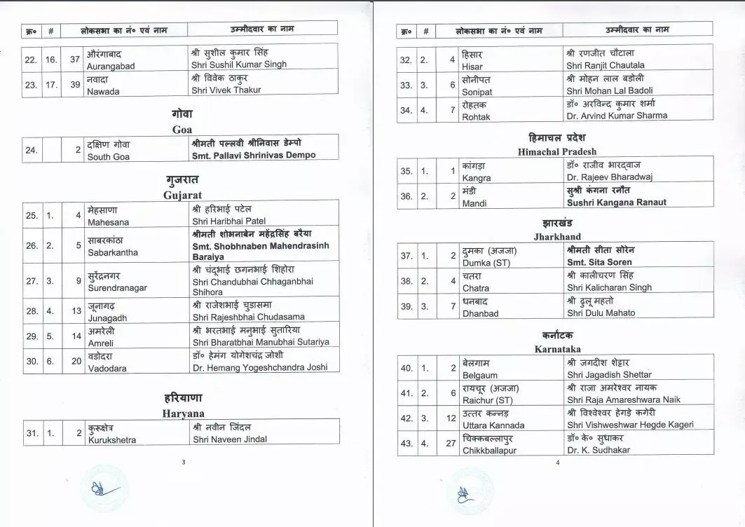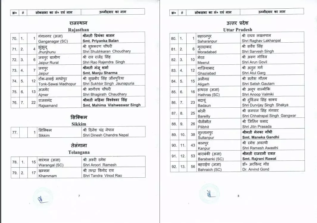 આ વખતે આ યાદીમાં સૌથી મોટું નામ જે ઉમેદવાર તરીકે ઉભરી આવ્યું છે તે ફિલ્મ અભિનેત્રી કંગના રનૌતનું છે. પાર્ટીએ તેમને હિમાચલ પ્રદેશની મંડીથી લોકસભા ચૂંટણી માટે મેદાનમાં ઉતાર્યા છે.આ સિવાય રામાયણ સિરિયલમાં રામનું પાત્ર ભજવનાર અરુણ ગોવિલ પણ ચૂંટણી લડશે.પાર્ટીએ તેમને મેરઠ લોકસભા સીટ પરથી મેદાનમાં ઉતાર્યા છે. આ યાદીમાં જે મોટા ઉમેદવારનું કાર્ડ કપાયું છે તે વરુણ ગાંધી છે, જેમની ટિકિટ આ વખતે પીલીભીતથી કપાઈ છે.