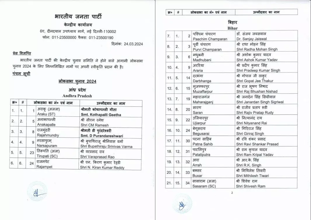 ભાજપે આજે જ પાર્ટીમાં સામેલ થયેલા નવીન જિંદાલને કુરુક્ષેત્રથી ટિકિટ આપી છે. પટના સાહિબથી રવિશંકર પ્રસાદને ઉમેદવાર બનાવવામાં આવ્યા છે. કેન્દ્રીય મંત્રી ગિરિરાજ સિંહ બેગુસરાયથી ચૂંટણી લડશે. લોકસભા ચૂંટણીને ધ્યાનમાં રાખીને ભાજપે રવિવારે ઉમેદવારોની પાંચમી યાદી જાહેર કરી છે.