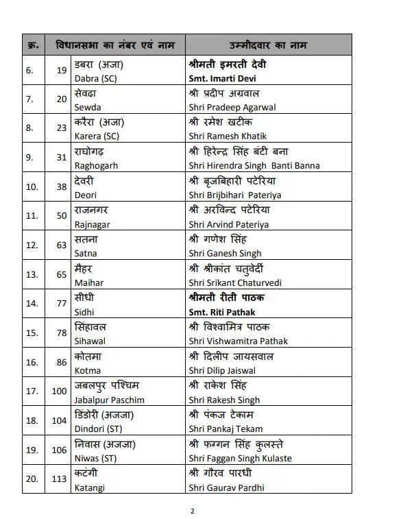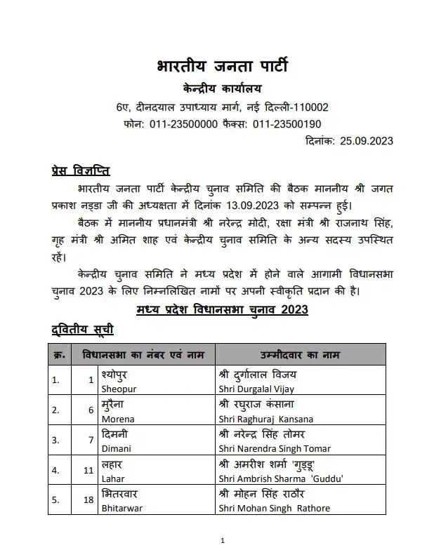 મધ્યપ્રદેશ વિધાનસભા ચૂંટણી 2023 માટે ભારતીય જનતા પાર્ટીએ 39 ઉમેદવારોની બીજી યાદી જાહેર કરી છે. આ યાદીમાં 7 સાંસદોને ટિકિટ આપવામાં આવી છે, જેમાંથી ત્રણ કેન્દ્રીય મંત્રીઓ છે. જેમાં પ્રહલાદ પટેલ, નરેન્દ્ર સિંહ તોમર અને ફગ્ગન સિંહ કુલસ્તે મોદી સરકારમાં મંત્રી છે.