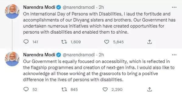 તેમણે ટ્વીટ કર્યું, 'આંતરરાષ્ટ્રીય દિવ્યાંગ વ્યક્તિઓના દિવસ પર, હું અમારી દિવ્યાંગ બહેનો અને ભાઈઓની હિંમત અને સિદ્ધિઓને બિરદાવું છું. અમારી સરકારે ઘણી પહેલ કરી છે, જેણે વિકલાંગ વ્યક્તિઓ માટે તકો ઊભી કરી છે અને તેમને ચમકવા માટે સક્ષમ બનાવ્યા છે.